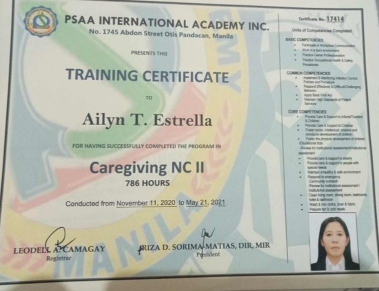 'ESTRELLA AILYN TOMACAS, from Philippines, has experience in general household work such as cleaning, laundry, ironing, etc. They are responsible, confident, and trustworthy. They speak English and are good with both children and the elderly.'